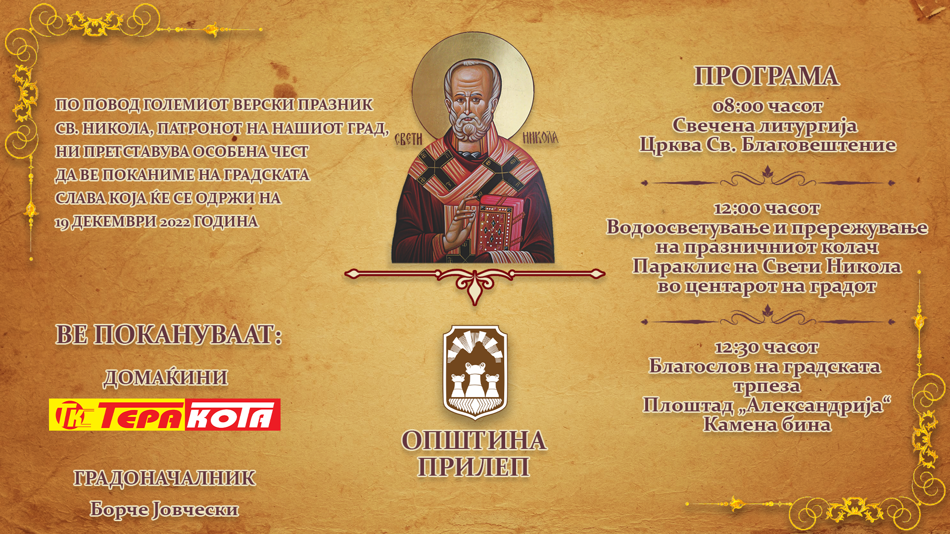 „Св. Никола е заштитник на градот и наш голем христијански празник. По тој повод на 19 декември, в понеделник, во центарот на градот, пред параклисот Св.Никола, во 12.00 часот, ги поканувам сите мои сограѓани да присуствуваат на чествувањето на градската слава и да бидат дел од одбележувањето на патронот на градот.“